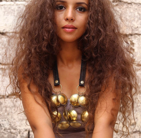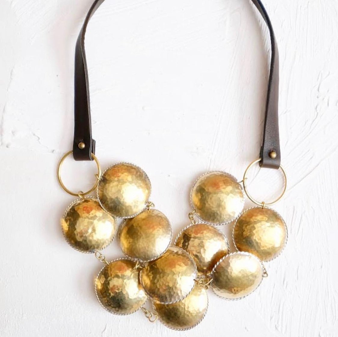 Stunning double-strands of hammered spherical discs on an adjustable leather neckband. Kamah is the word for moon in the Moroccan dialect. The Kamah Collection takes inspiration from the lunar phases, with bold and oversized handcrafted pieces in lunar shapes.