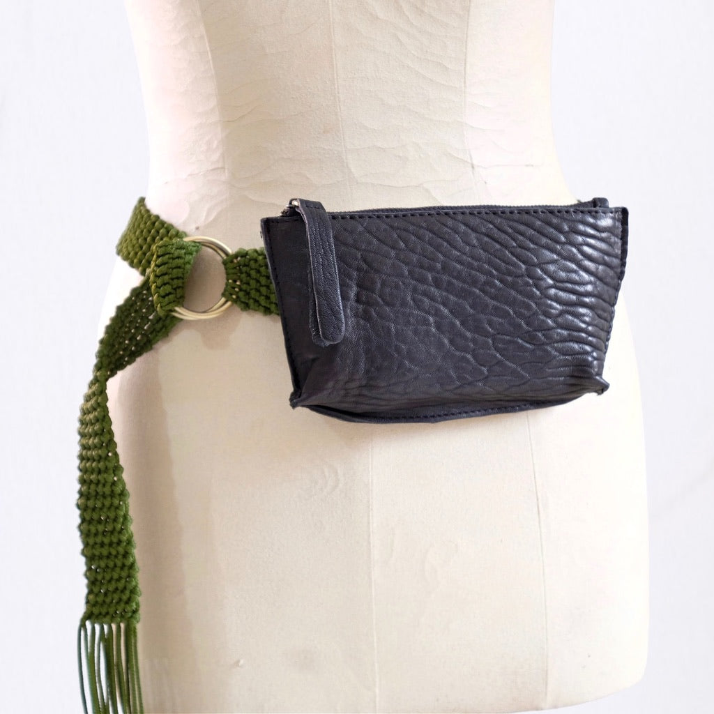 Soft pebbled cognac leather belt bag (bumbag) with an Olive long-fringed macrame belt. Can be worn around your waist or across your body. Slip out the macrame belt, and use the clutch and the belt separately.